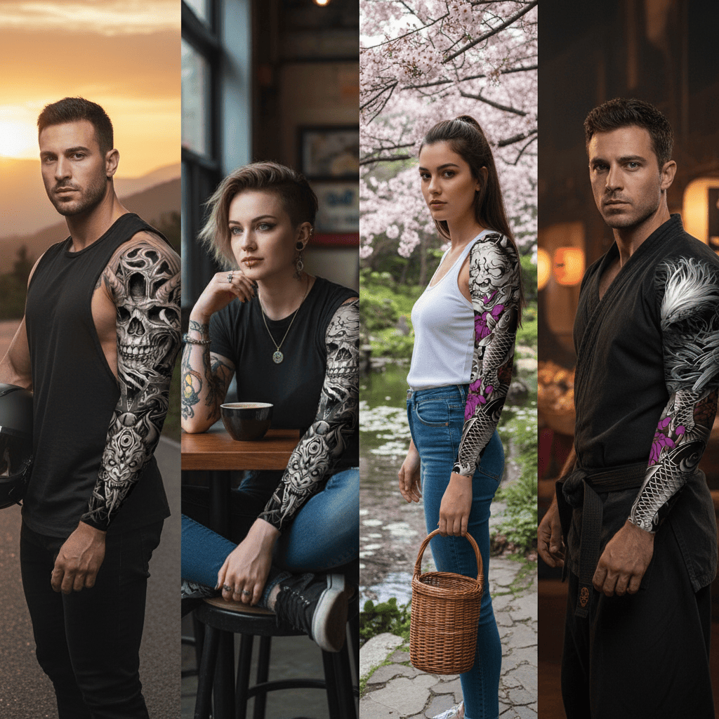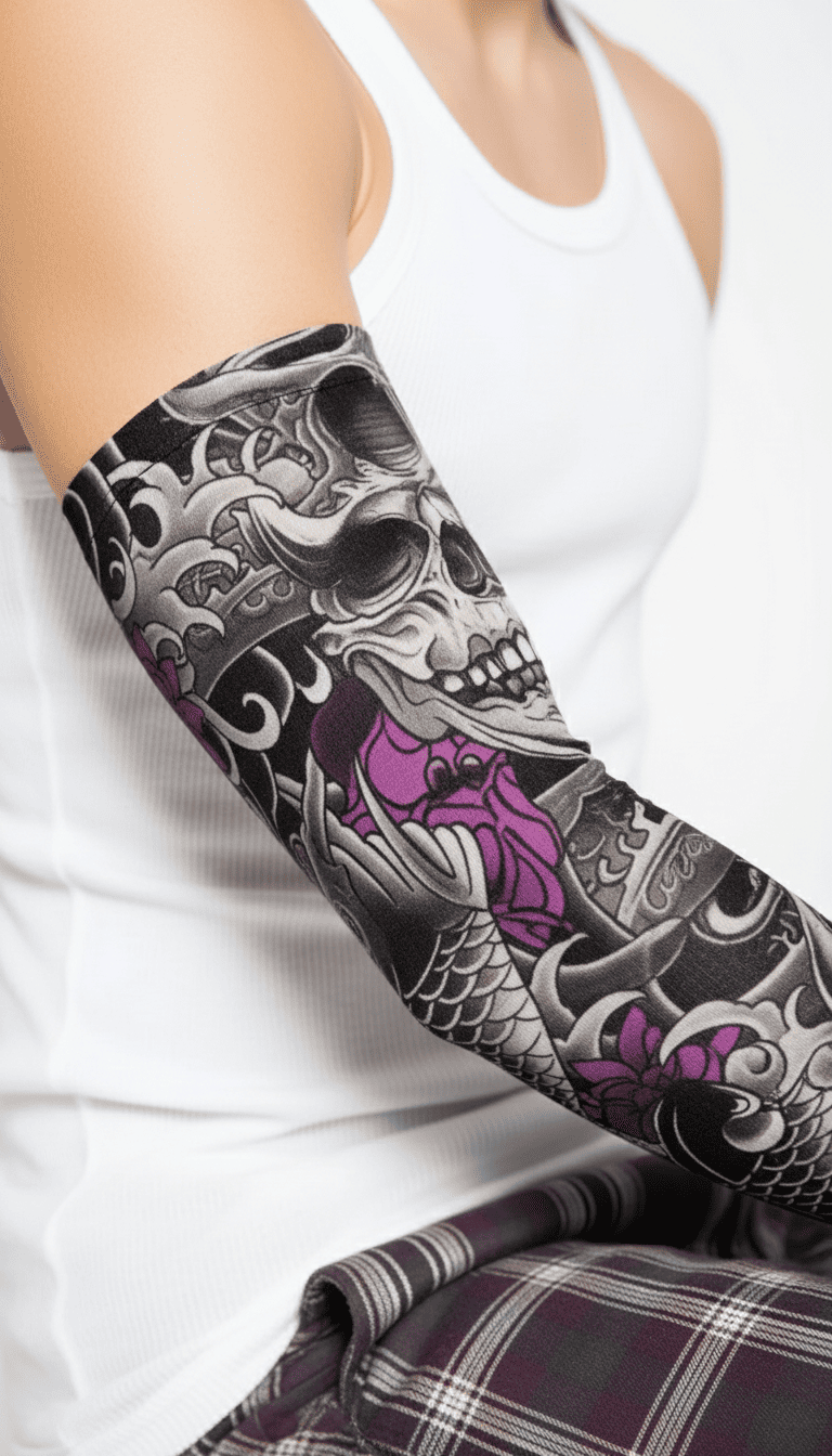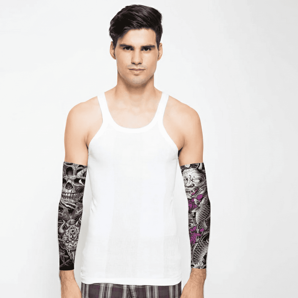 Ingin punya tato nyentrik nan keren di lengan, tapi terkendala berbagai hal? Gunakan saja sarung lengan. Tampak nyata dan sepintas orang lain tak akan menyadari bahwa ini hanya tato palsu belaka. Stocking tato ini mudah dipasang maupun dilepas, layaknya stocking biasa.